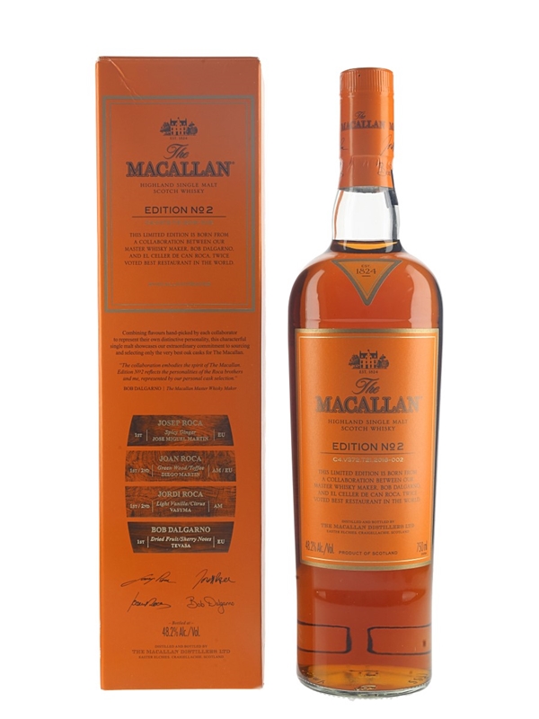 A bottle of The Macallan Edition No.2 Highland Single Malt Scotch Whisky bottled at 48.2% ABV. This is a limited edition matured in four distinct cask types selected by master blender Bob Delgarno and Spanish chefs Joan, Josep and Jordi Roca from El Celler de Can Roca. The restaurant was twice voted best restaurant in the world.