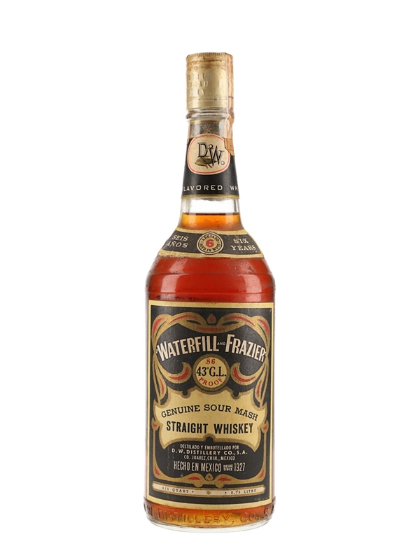 A bottle of Waterfill and Frazier 6 Year Old Straight Sour Mash Whiskey, made in Mexico to a genuine American recipe. We estimate this was bottled in the 1970s.