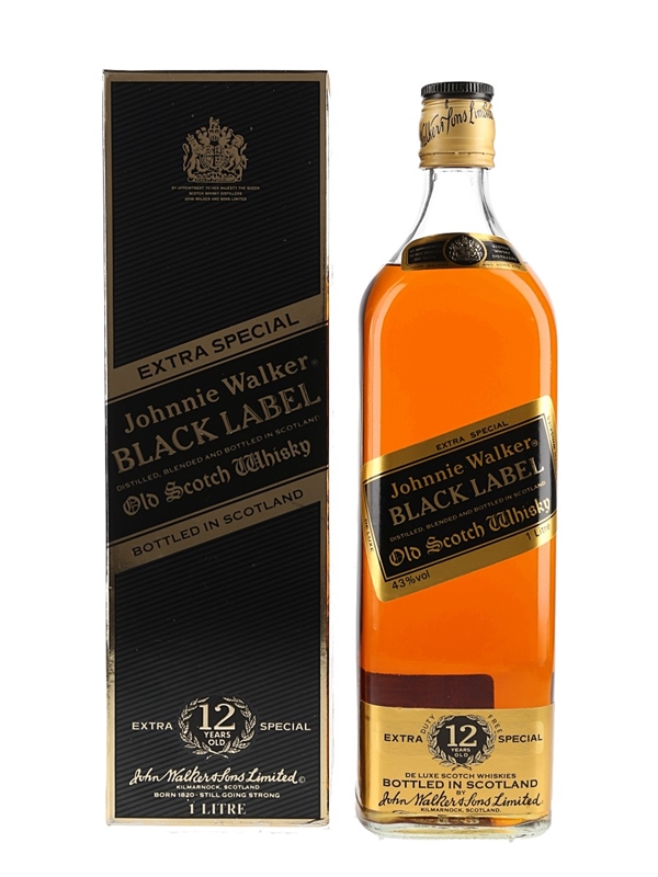 A litre bottle of Johnnie Walker Black Label 12 Year Old Extra Special Old Scotch Whisky. We estimate in the 1980s.