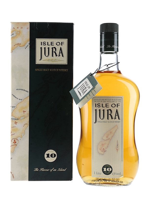 A litre bottle of Isle of Jura 10 Year Old Single Malt Scotch Whisky. We estimate this was bottled in the 1990s.