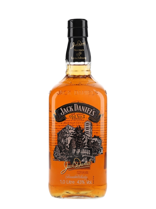 A litre bottle of Jack Daniel's Old No.7 Brand Tennessee Whiskey, the second edition in Jack Daniel's Scenes from Lynchburg series. This has an image of a truck carrying barrels up Distillery Lane.