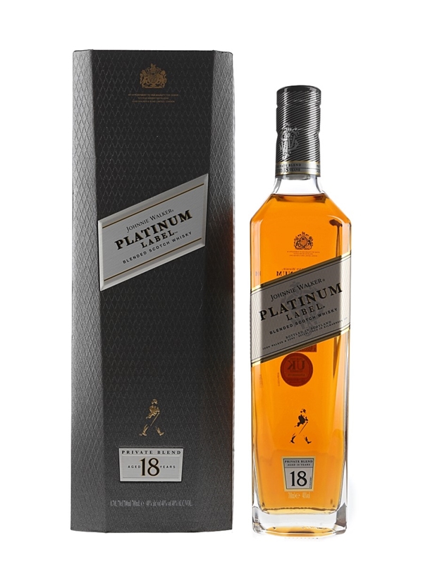 A bottle of Johnnie Walker Platinum Label 18 Year Old Blended Scotch Whisky in a presentation box.
