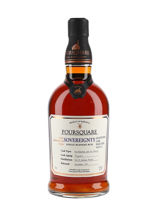 A bottle of Foursquare Sovereignty 14 Year Old Fine Barbados Single Blended Rum. This was matured in a combination of ex-bourbon and ex-sherry casks for 14 years, bottled at a cask strength of 62% ABV and released in November 2021 for Exceptional Cask Selection Mark XIX.