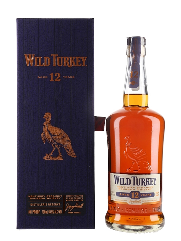 A bottle of Wild Turkey Distiller's Reserve 12 Year Old Kentucky Straight Bourbon Whiskey, bottled at 101 proof, or 50.5% ABV by the Austin Nichols Distilling Company. This was bottled for the Japanese market.
