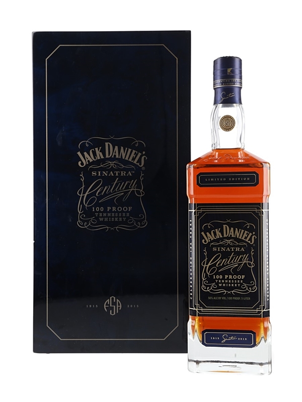 A limited edition litre bottle of Jack Daniel's celebrating the life of Frank Sinatra, who would have turned 100 in 2015. Bottled at 100 proof from 100 casks specially selected by master distiller Jeff Arnett.
