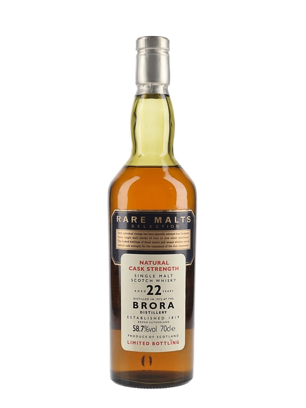 A limited edition bottle of Brora 22 Year Old Natural Cask Strength Single Malt Scotch Whisky. This was distilled in 1972 and bottled at a cask strength of 58.7% ABV for Diageo's now-discontinued Rare Malts Selection range.