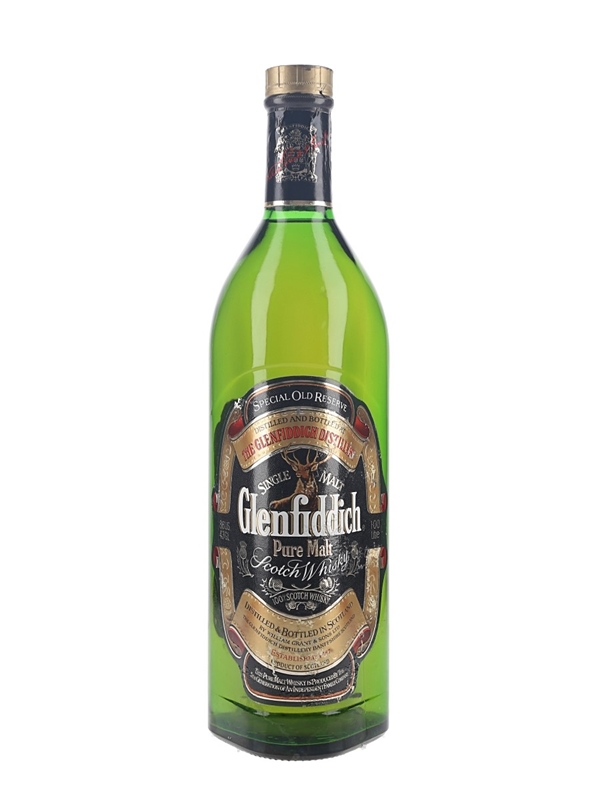 A litre bottle of Glenfiddich Special Old Reserve Pure Single Malt Scotch Whisky produced by William Grant & Sons Ltd. We estimate this was bottled in the 1980s.