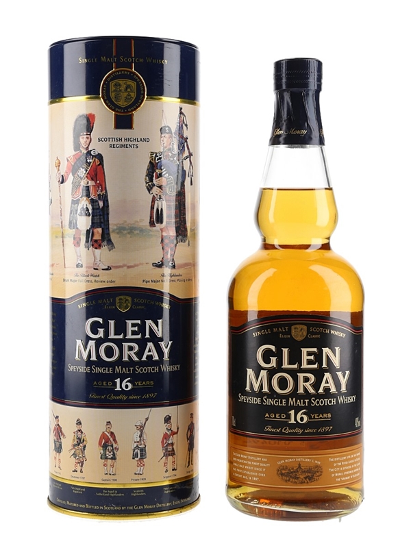 A bottle of Glen Moray 16 Year Old Speyside Single Malt Scotch Whisky presented in a Scotland's Historic Highland Regiments tin.
