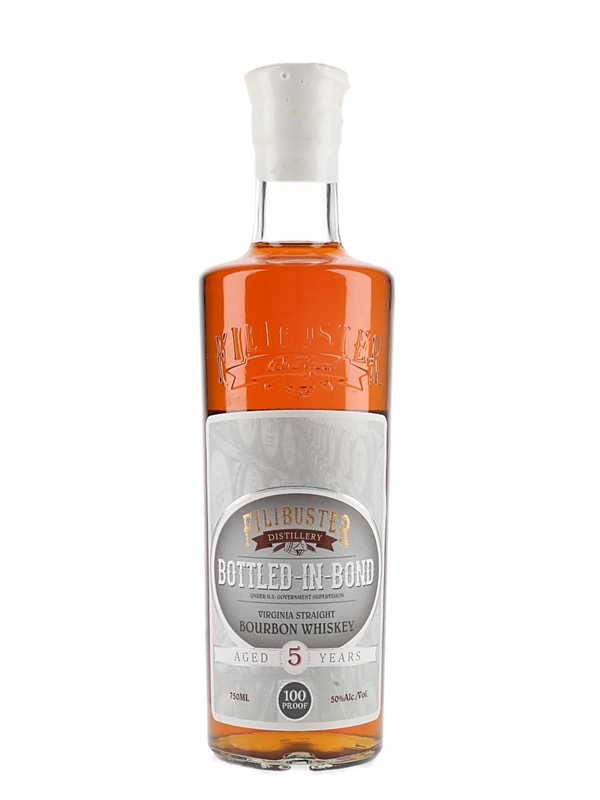 A bottle of Filibuster 5 Year Old Virginia Straight Bourbon Whiskey double distilled and bottled in bond.