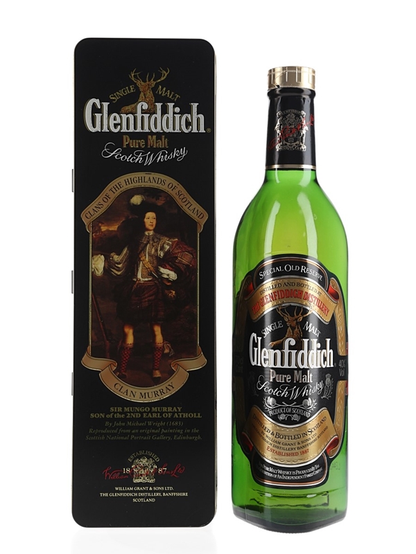A bottle of Glenfiddich Special Reserve Single Malt Scotch Whisky in a Clans of the Highlands of Scotland presentation tin.