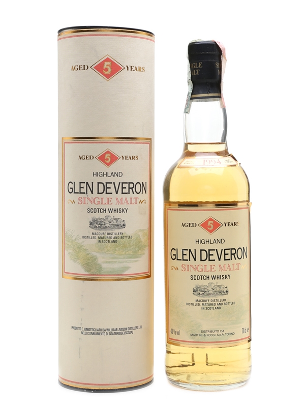 A bottle of Glen Deveron, the name given to official bottlings from Macduff distillery. This single malt was distilled in 1994 and bottled at 5 years of age for the Italian market.