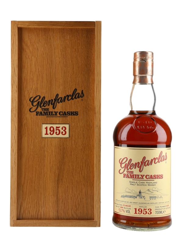 A bottle of Glenfarclas 1953 Single Malt Scotch Whisky. This was distilled in 1953, matured in a sherry butt and bottled at 53.7% ABV on 27 February 2007 as part of The Family Casks series.