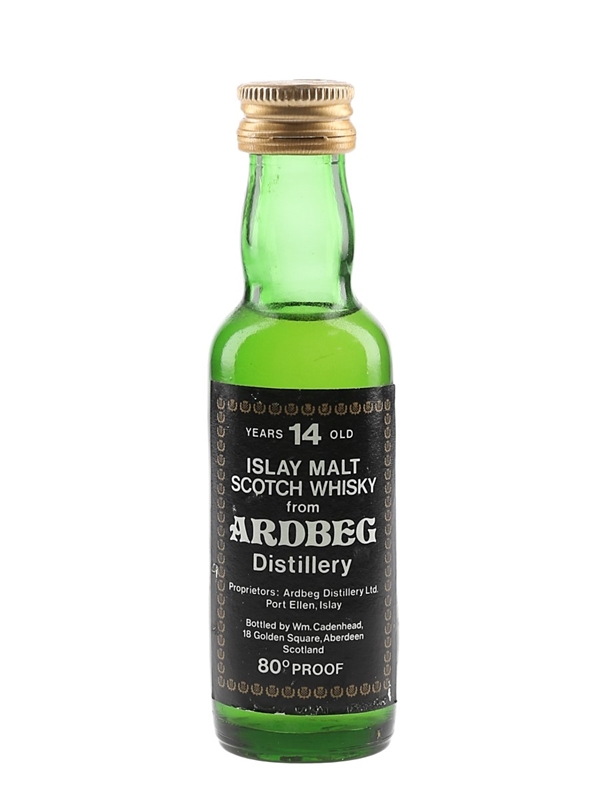 A miniature bottle of Ardbeg 14 Year Old Islay Malt Scotch Whisky, distilled by proprietors Ardbeg Distillery Ltd. This was bottled by Cadenhead's, we estimate in the 1970s.