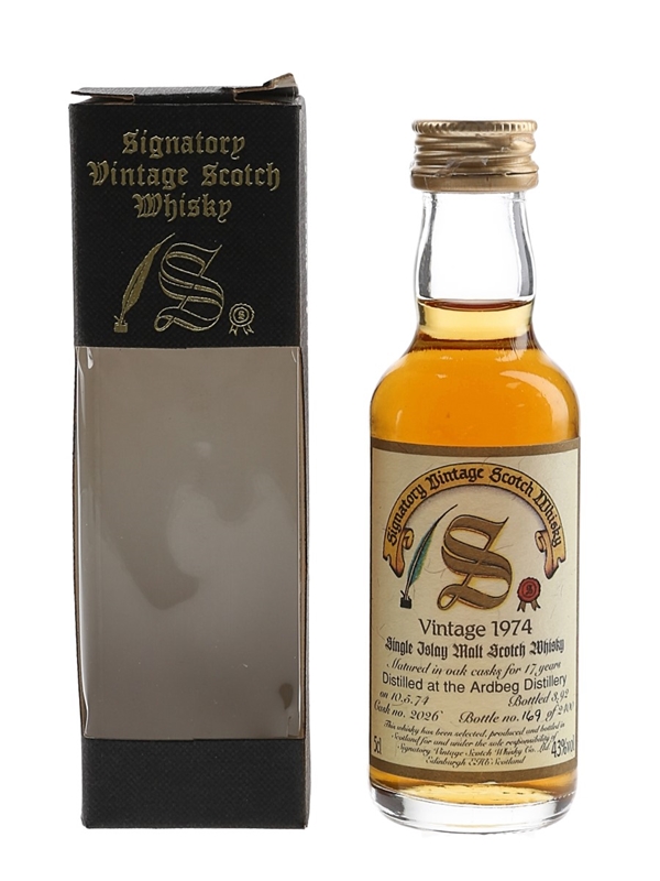 A miniature bottle of Ardbeg 1974 17 Year Old Single Islay Malt Scotch Whisky. This was distilled on 10 May 1974, matured in a single oak cask and bottled in March 1992 by Signatory Vintage.