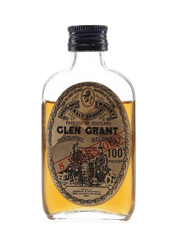 A miniature bottle of Glen Grant 8 Year Old 100° Proof Highland Malt Scotch Whisky, bottled by Gordon & MacPhail. We estimate this was bottled in the 1970s.