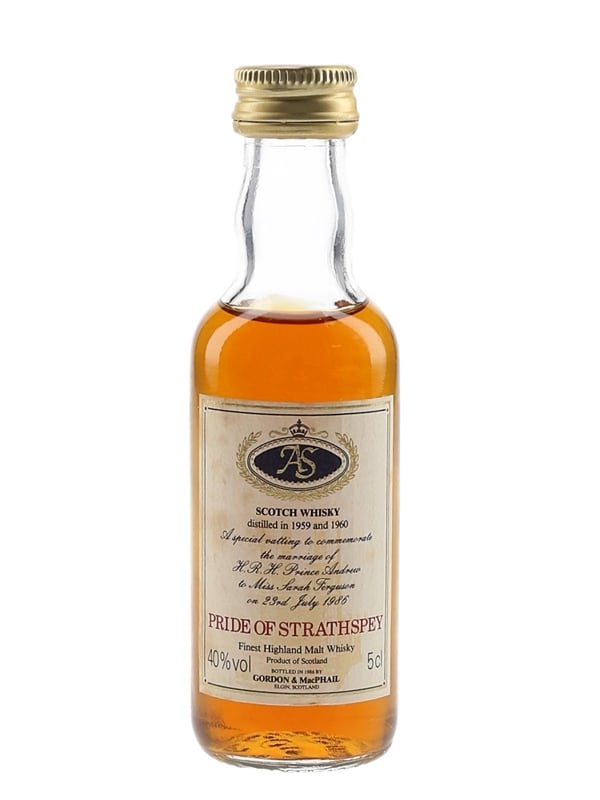 A miniature bottle of Pride of Strathspey Finest Highland Malt Whisky, bottled by Gordon & MacPhail. This is a vatting of two vintages distilled in 1959 and 1960, bottled to commemorate the marriage of Prince Andrew and Sarah Ferguson on 23 July 1986.