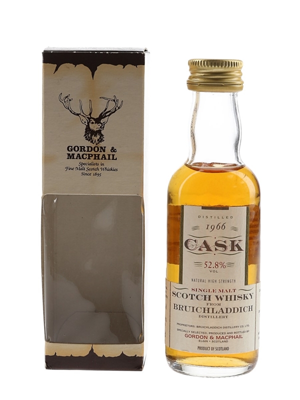 A miniature bottle of Bruichladdich Single Malt Scotch Whisky, distilled on 7 March 1966 and bottled in June 1996 by Gordon & MacPhail as part of the Cask Strength series.
