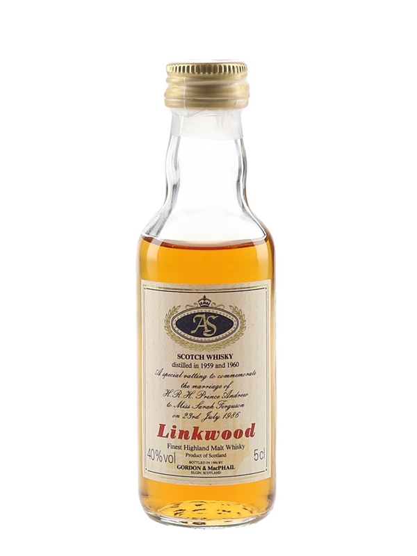 A miniature bottle of Linkwood Finest Highland Malt Whisky, bottled by Gordon & MacPhail. This is a vatting of two vintages distilled in 1959 and 1960, bottled to commemorate the marriage of Prince Andrew and Sarah Ferguson on 23 July 1986.