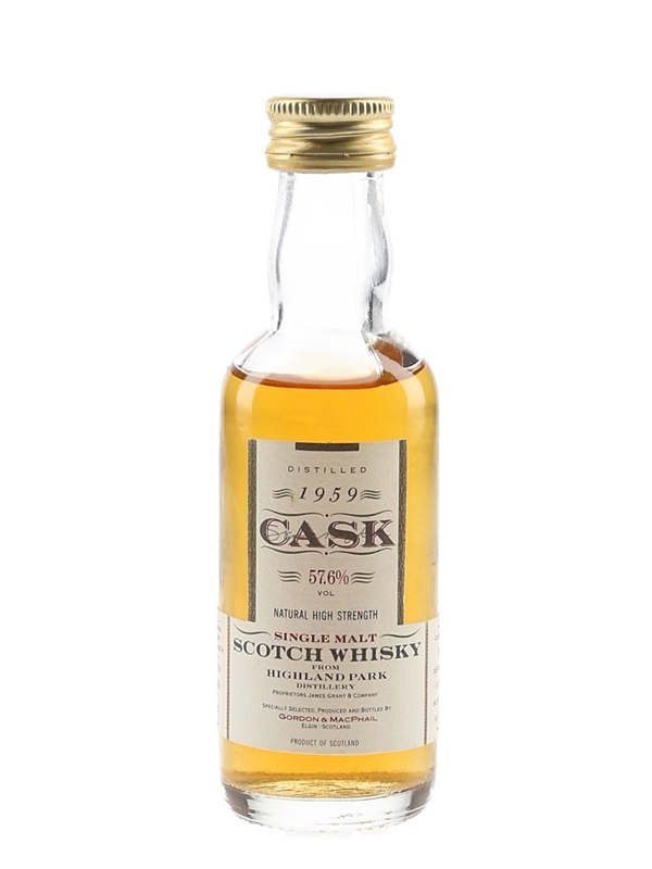 A miniature bottle of Highland Park Single Malt Scotch Whisky. This was distilled on 14 July 1959 before being bottled in July 1991 by Gordon & MacPhail at 57.6% ABV. This was bottled from cask number 598.