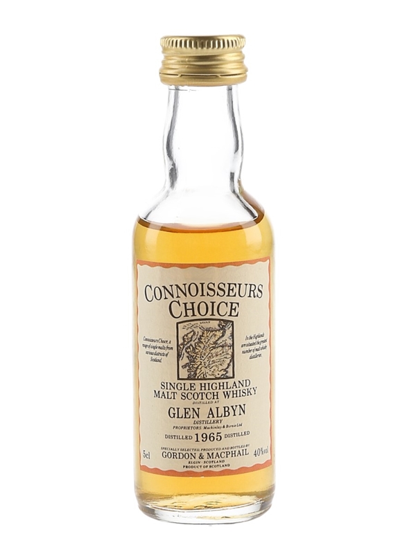 A miniature bottle of Glen Albyn 1965 Single Highland Malt Scotch Whisky. This was bottled by Gordon & MacPhail as part of the Connoisseurs Choice series, we estimate in the 1990s.