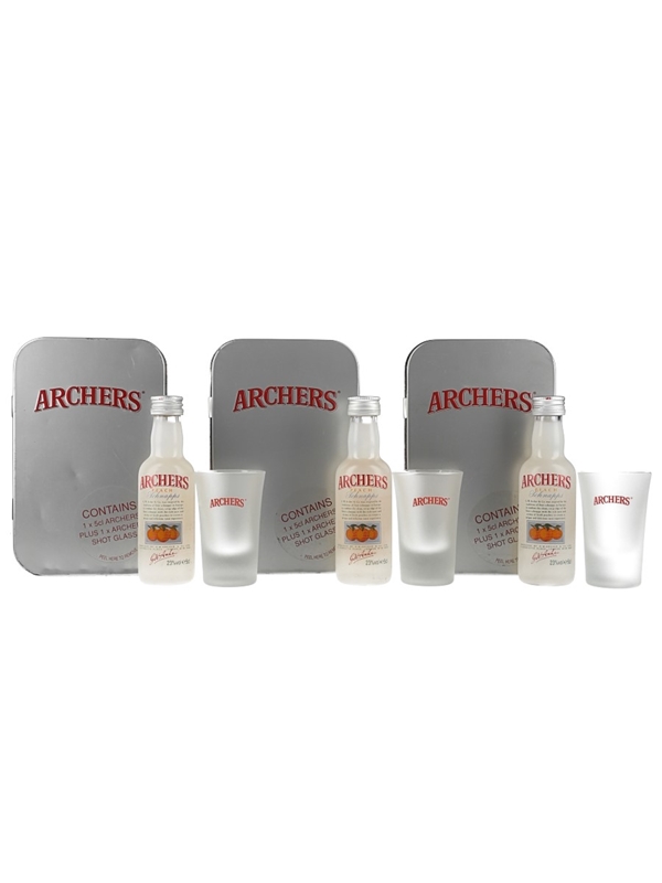 This lot contains three miniature bottles of Archers Peach Schnapps with a branded shot glass in a presentation tin box.