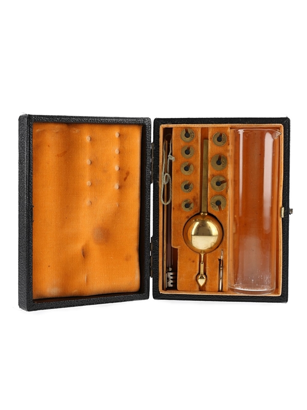 This comes in a fabric lined leather box, measuring approximately 14cm x 10cm x 4cm and contains a hydrometer, a glass beaker, a set of weights, a tiny magnifying glass and a thermometer branded W.R. Loftus Ltd, London.