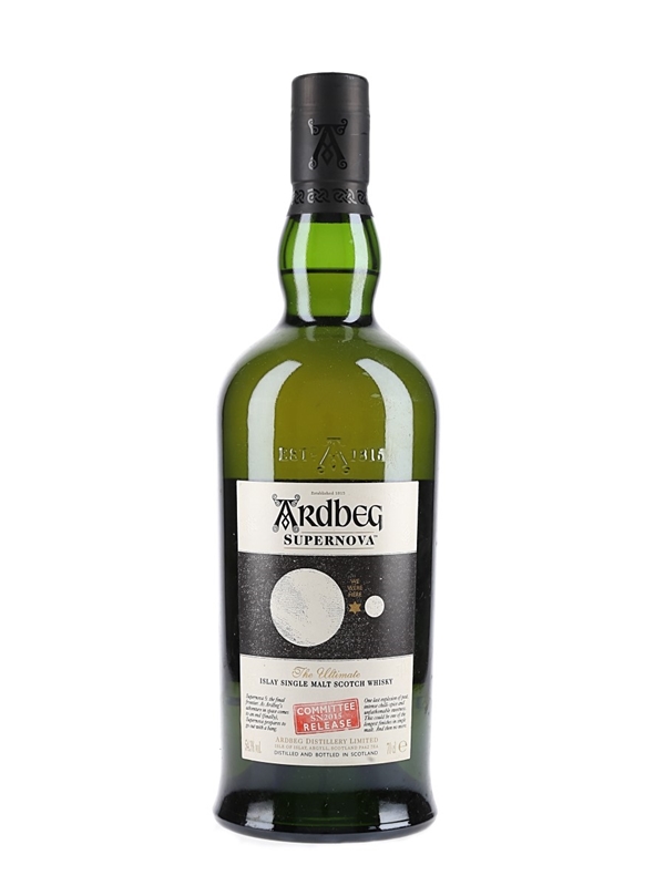A bottle of Ardbeg Supernova The Ultimate Islay Single Malt Scotch Whisky. This is the 2015 Committee Release and was bottled at 54.3% ABV.