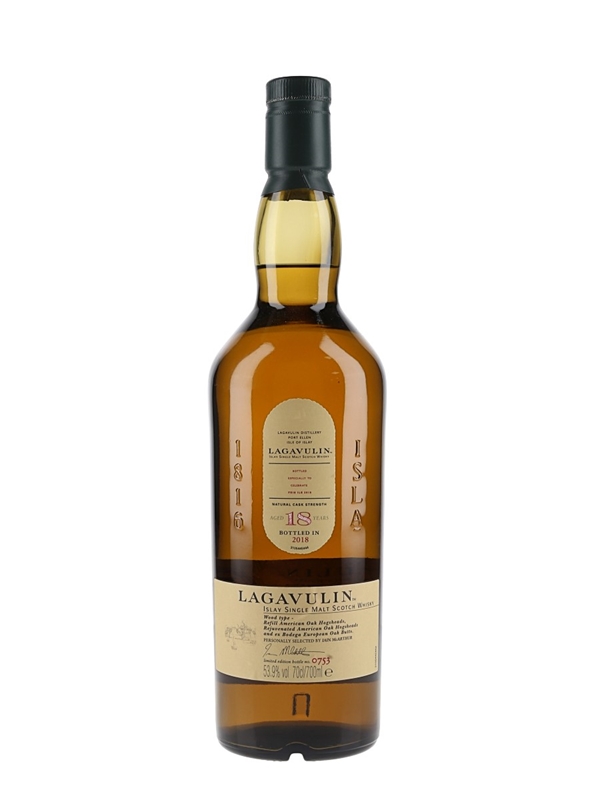 A limited edition bottle of Lagavulin 18 Year Old Islay Single Malt Scotch Whisky, released to celebrate Feis Ile 2018. This was matured in refill American hogsheads, rejuvenated American oak hogsheads, and ex-Bodega European oak butts personally selected by Ian McArthur.