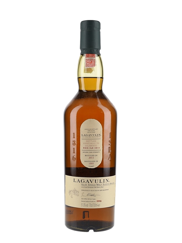 A bottle of Lagavulin Islay Single Malt Scotch Whisky. This was distilled on 8 May 1995, matured in an European oak sherry butt, selected by Iain McArthur and bottled at 51% ABV especially for Feis Ile 2013, the Islay festival of music and malt.