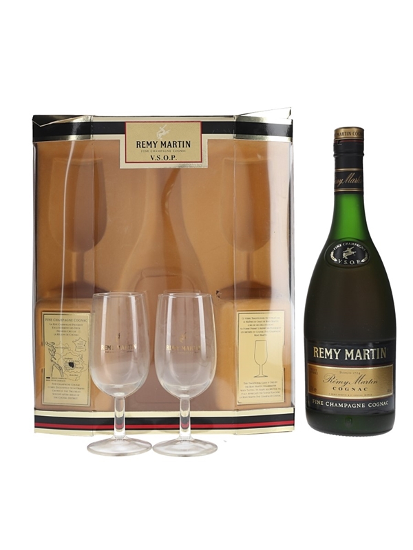 A bottle of Rémy Martin VSOP Fine Champagne Cognac glasses set with two branded glasses. We estimate this was bottled in the late 1980s to 1990s.