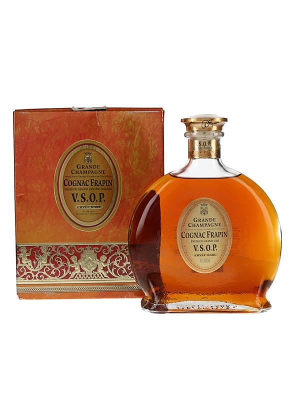 A bottle of Frapin VSOP Cuvée Rare Cognac, made from grapes grown in Grande Champagne, the Premier Cru of Cognac.