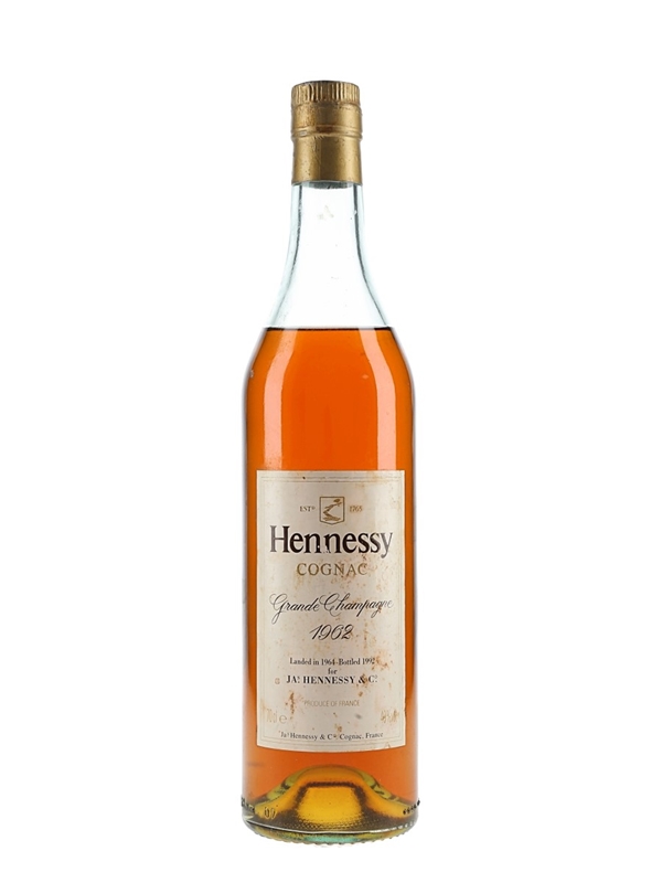 A bottle of Hennessy Grande Champagne Vintage 1962 early-landed Cognac, landed in 1964 and bottled in 1992.