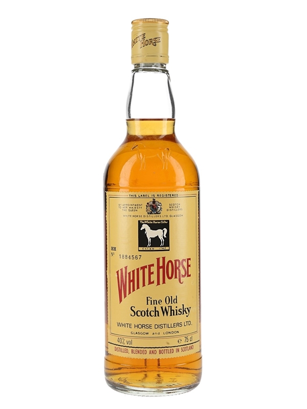 A bottle of White Horse Fine Old Scotch Whisky. We estimate this was bottled in the 1980s.