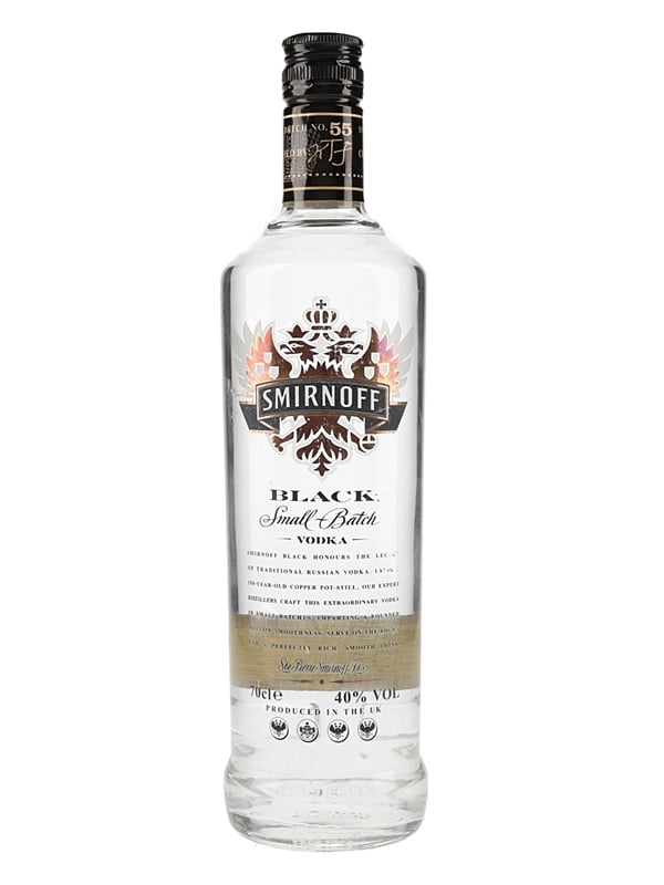 A bottle of Smirnoff Black Small Batch Vodka distilled and bottled in the UK.