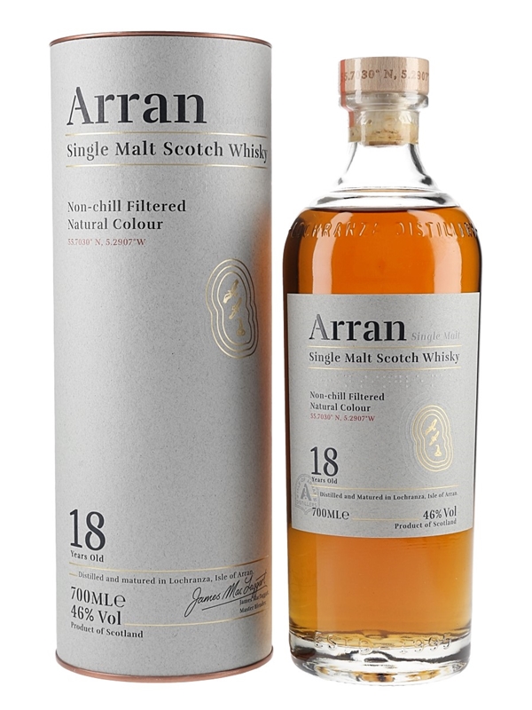 A bottle of Arran 18 Year Old Single Malt Scotch Whisky, bottled at 46% ABV.