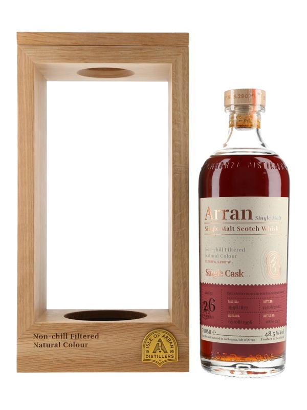 A bottle of Arran 26 Year Old Single Cask Single Malt Scotch Whisky. This was distilled on 5 August 1996, matured in a single sherry cask and bottled at a cask strength of 48.5% ABV on 22 August 2022.