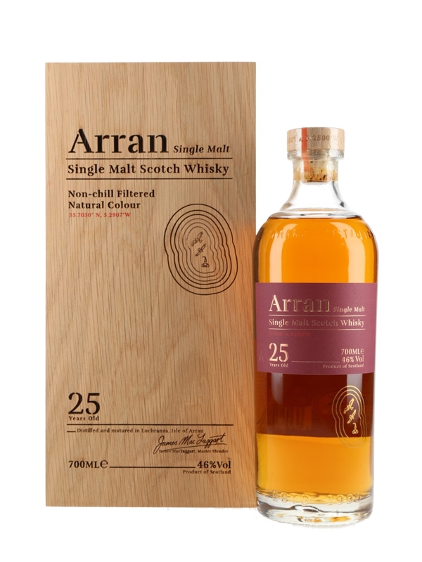 A bottle of Arran 25 Year Old Single Malt Scotch Whisky, distilled and matured in Lochranza, Isle of Arran.