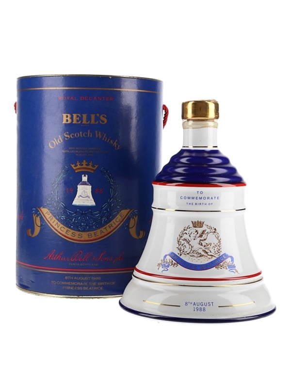 A bottle of Bell's Old Scotch Whisky oroduced by Arthur Bell & Sons. This was presented in a Wade porcelain decanter and released to celebrate the birth of Princess Beatrice on 8 August 1988.