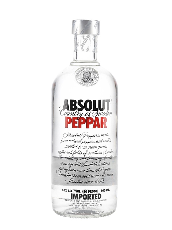 A 50cl bottle of Absolut Peppar vodka from Sweden.