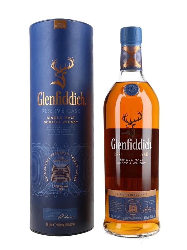 A litre bottle of Glenfiddich Reserve Cask Single Malt Scotch Whisky. This was matured in oloroso sherry casks before marrying in the distillery's Solera Vat No.2.