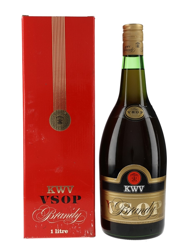 A litre bottle of KWV Ko-operatieve Wijnbouwers Vereniging VSOP brandy from South Africa. This was distilled in copper pot stills and matured in oak casks.