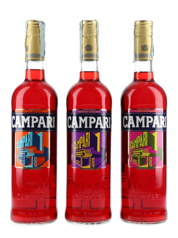 This lot contains three bottles of Campari Bitter liqueur produced Italy. These are The Art Label Collection, bottled to celebrate the 150th Anniversary of Campari.