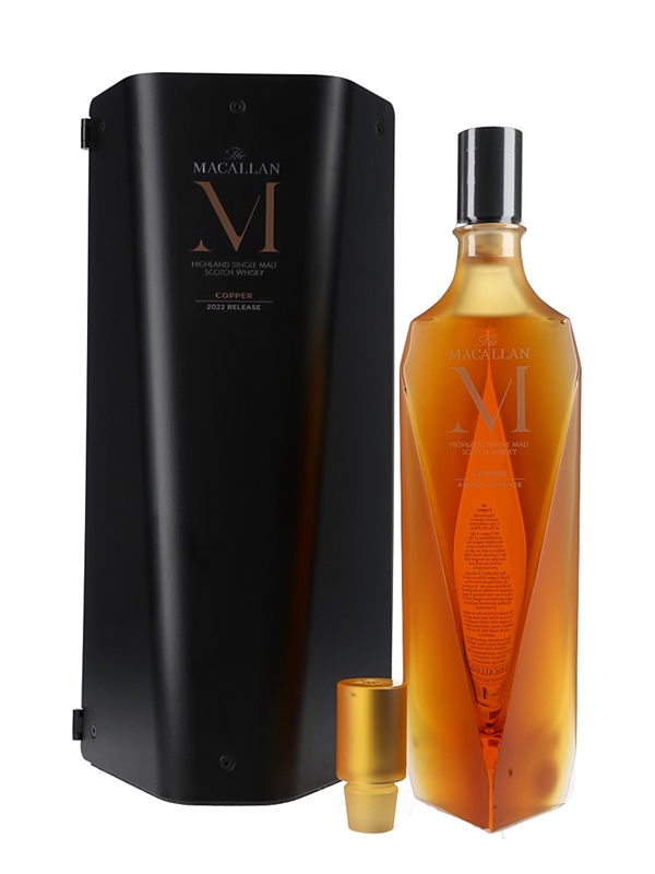 A bottle of The Macallan M Copper 2022 release Highland Single Malt Scotch Whisky. This comes in a presentation box with crystal stopper.