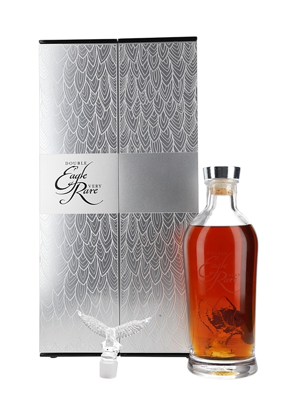 A limited edition bottle of Eagle Rare Double Eagle Very Rare 20 Year Old Kentucky Straight Bourbon Whiskey, bottled by Buffalo Trace Distillery. This is the fourth edition and is presented in a crystal bottle with a eagle shaped stopper in a light up wooden presentation box.