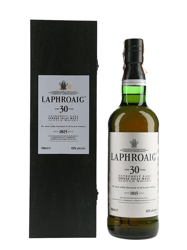 A bottle of Laphroaig 30 Year Old Single Islay Malt Scotch Whisky, bottled at 43% ABV and presented in a wooden case. This was bottled for the US market and imported by Hiram Walker & Sons. We estimate this was bottled in the 2000s.