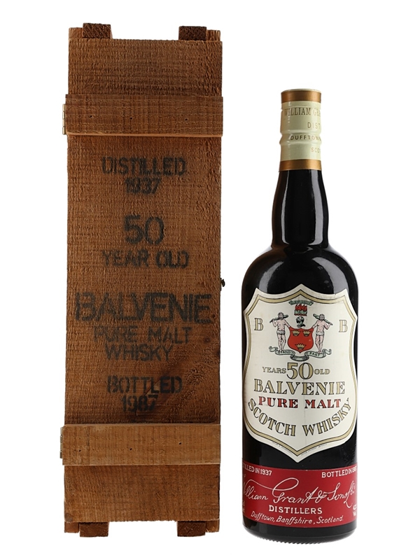 A bottle of Balvenie 50 Year Old Pure Malt. This was distilled in 1937 and bottled in 1987, with the majority of the bottles sold to Milroys of Soho in London.
