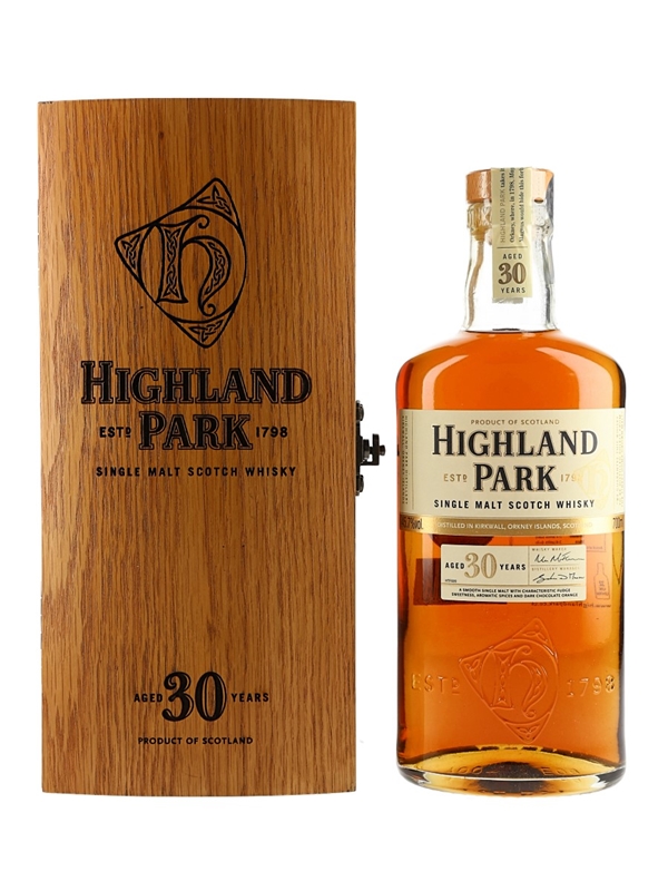 A bottle of Highland Park 30 Year Old Single Malt Scotch Whisky, presented in a wooden presentation box.