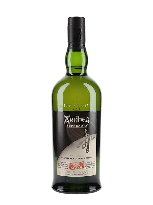 A bottle of Ardbeg Supernova Islay Single Malt Scotch Whisky. This 2014 Committee Release was bottled at 55% ABV.