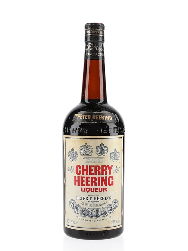 A bottle of Cherry Heering liqueur produced in Copenhagen, Denmark. We estimate this was bottled in the 1970s.