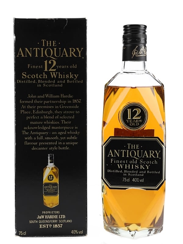 A bottle of The Antiquary 12 Year Old Finest Old Scotch Whisky, produced by J & W Hardie Ltd. We estimate this was bottled in the 1980s.